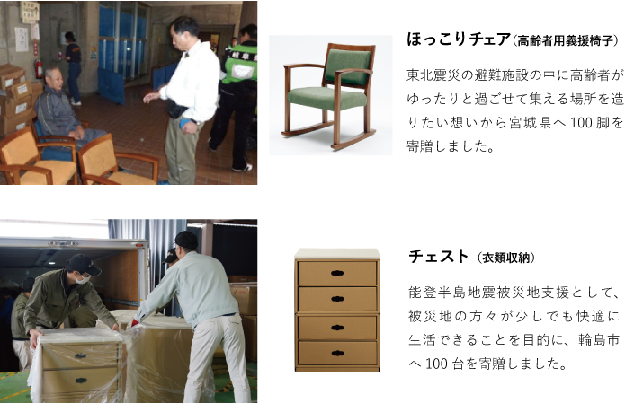 これまでに、東日本大震災と令和6年能登半島地震では椅子や衣類収納といった義援品を提供し、被災地域の早期復旧のため支援してきました。
