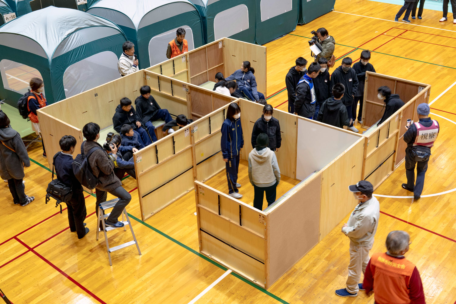避難所開設時には、短時間で居住スペースを⽴ち上げられる実⽤的な構造です。