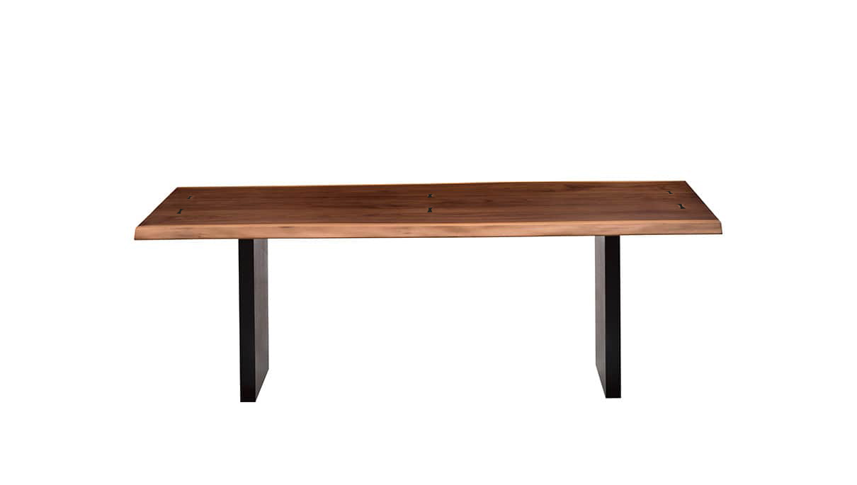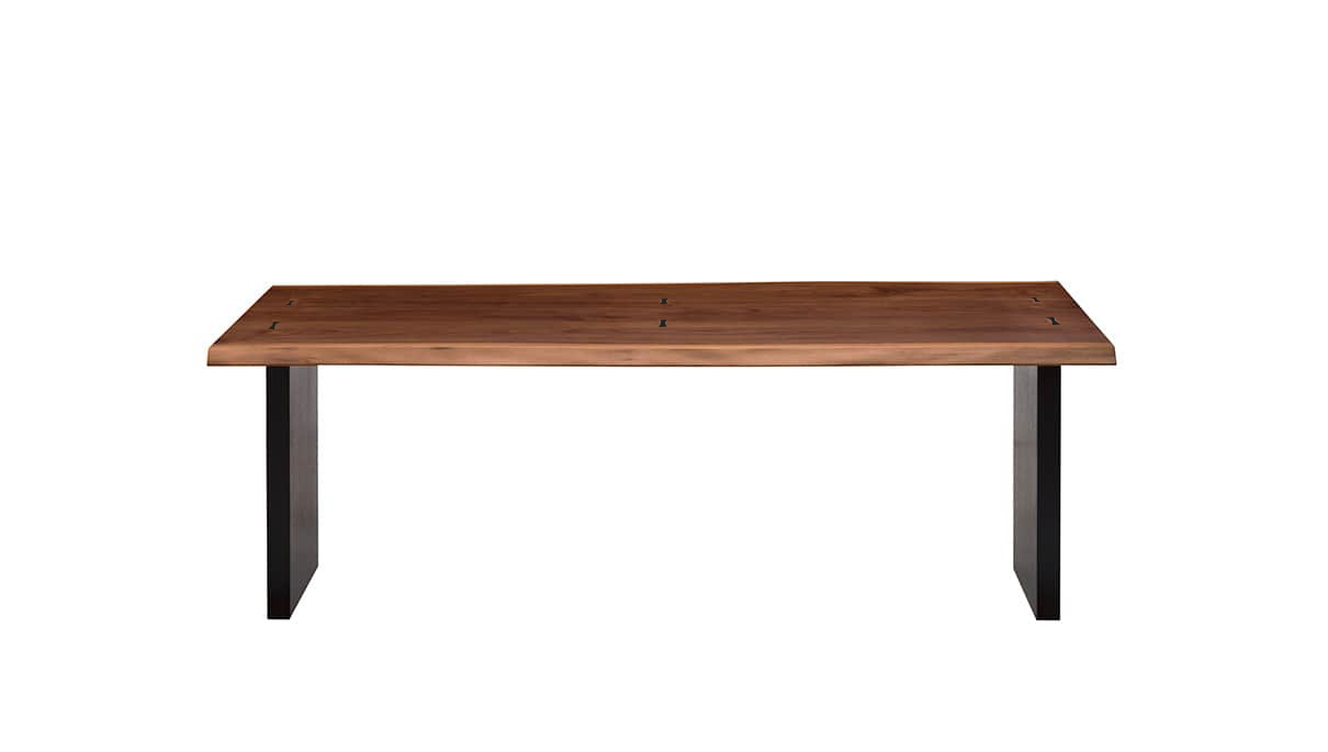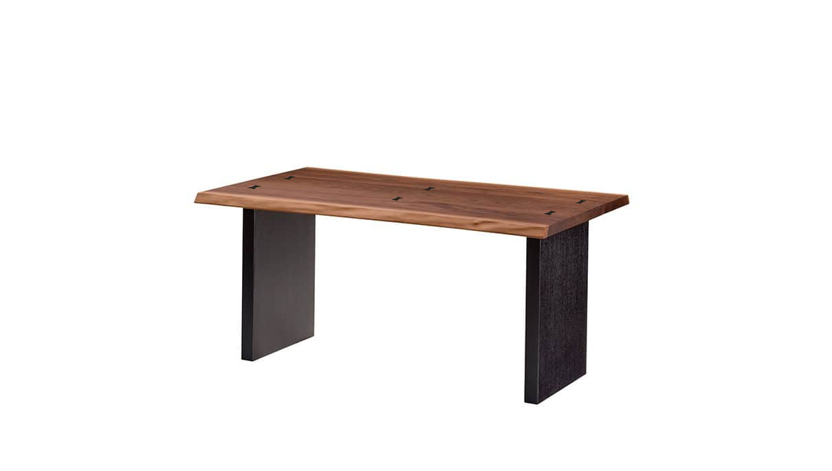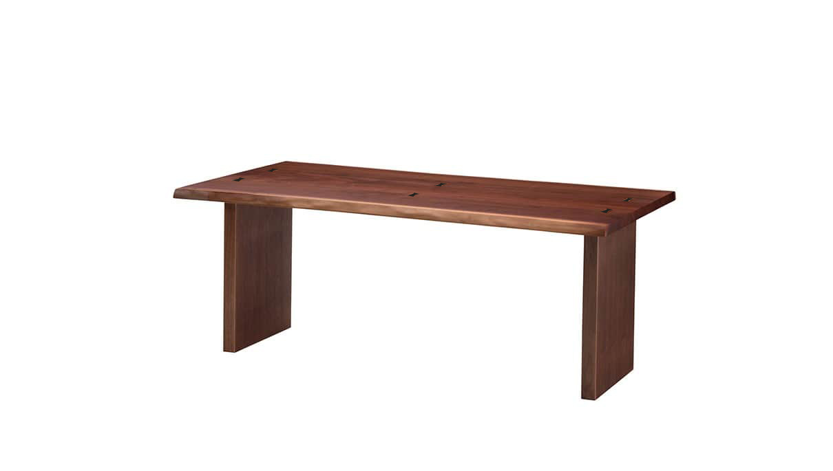 厳選した40mm厚のウォールナット無垢材を三枚接ぎで仕上げた贅沢なハイエンドテーブルです。まるで一枚板のような大らかで美しい木目と、無垢材の風合いを活かす天板両側の耳。「契り」と呼ばれる伝統的な接合技法を加えることが可能です。