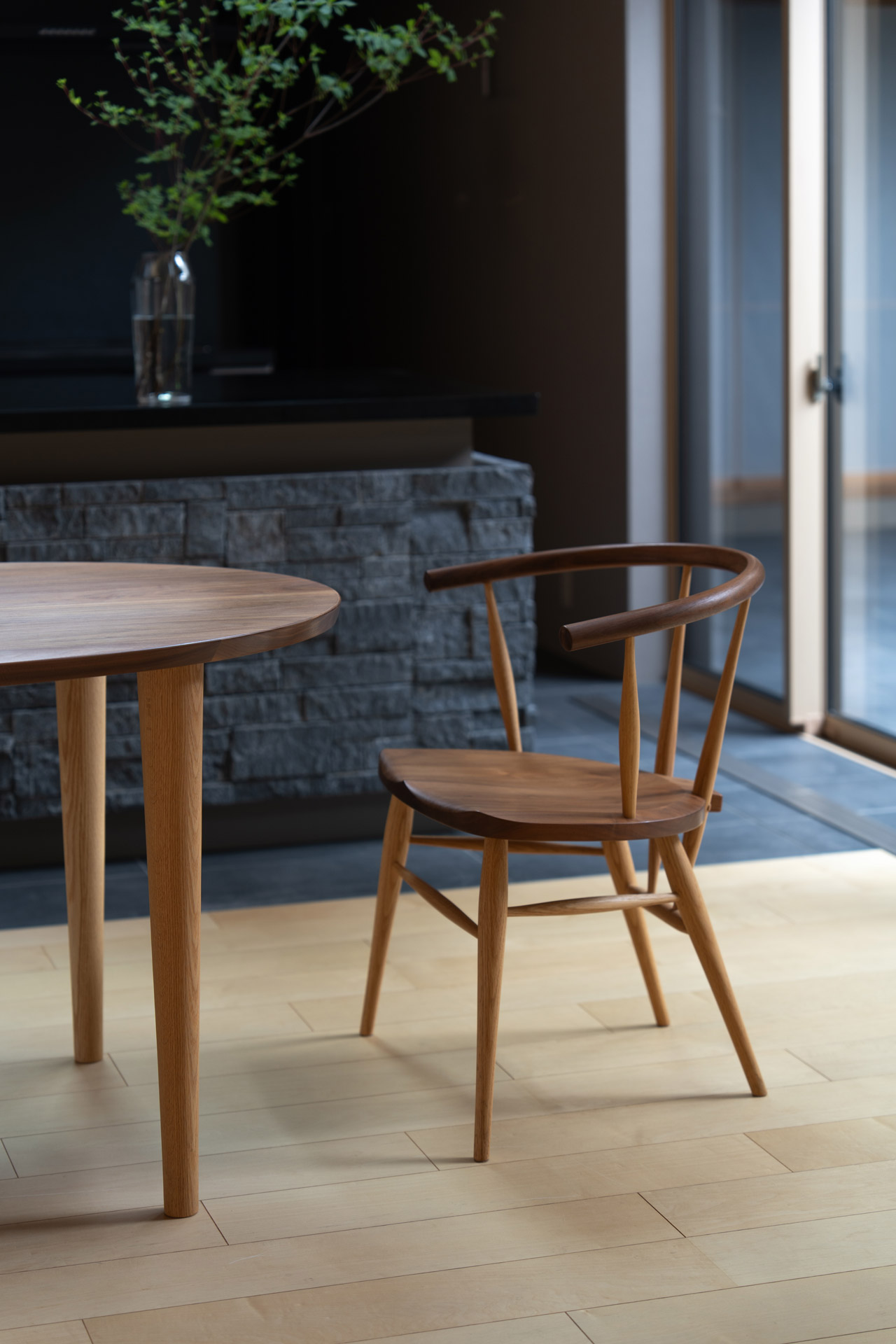 KURA WINDSOR(クラ・ウィンザー)のチェア・シリーズは、デザイナー岩倉榮利と高山の家具挽物技術との出会いに始まり、現代日本における新しいウィンザー・スタイルを「リ・デザイン」という手法によって作り上げました。笠木と挽物の支柱、H字型の貫をつけた脚を厚い木座板の上面、下面に正確に取り付ける技術を土台に、現代的かつ日本的な(パーツのモデュールやバランス、素材の扱いなどの)編集作業を通して、独自の美しさを獲得しています。そこには、一方に新しい素材とそれを活かす斬新な形を創造するものづくりの方法があり、一方で昔から引き継がれてきた様式や技術を時代、地域性や使 う人々の特性に従って変化させていくことも、ひとつのデザイン手法であるという提言が見てとれます。