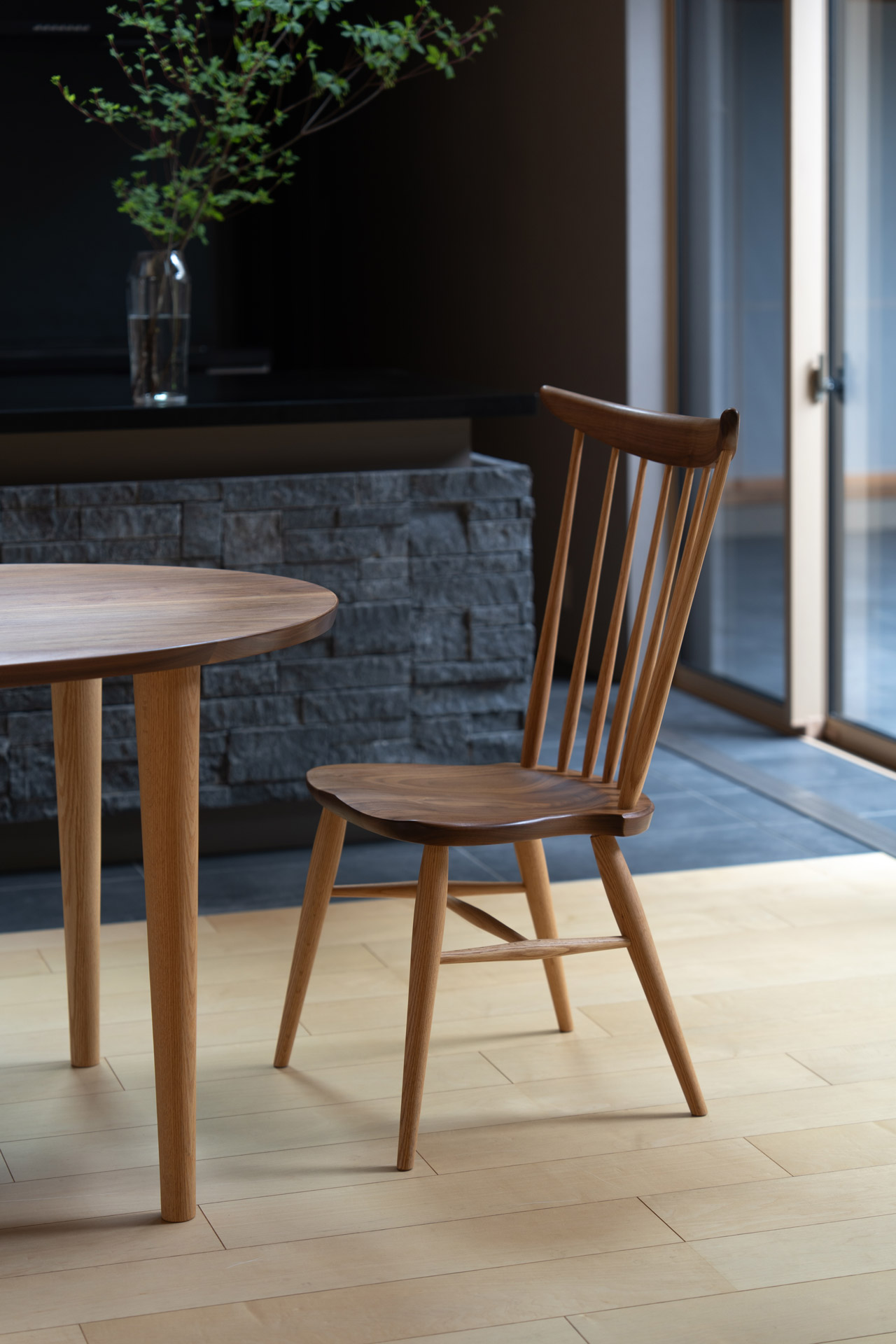 KURA WINDSOR(クラ・ウィンザー)のチェア・シリーズは、デザイナー岩倉榮利と高山の家具挽物技術との出会いに始まり、現代日本における新しいウィンザー・スタイルを「リ・デザイン」という手法によって作り上げました。笠木と挽物の支柱、H字型の貫をつけた脚を厚い木座板の上面、下面に正確に取り付ける技術を土台に、現代的かつ日本的な(パーツのモデュールやバランス、素材の扱いなどの)編集作業を通して、独自の美しさを獲得しています。そこには、一方に新しい素材とそれを活かす斬新な形を創造するものづくりの方法があり、一方で昔から引き継がれてきた様式や技術を時代、地域性や使 う人々の特性に従って変化させていくことも、ひとつのデザイン手法であるという提言が見てとれます。