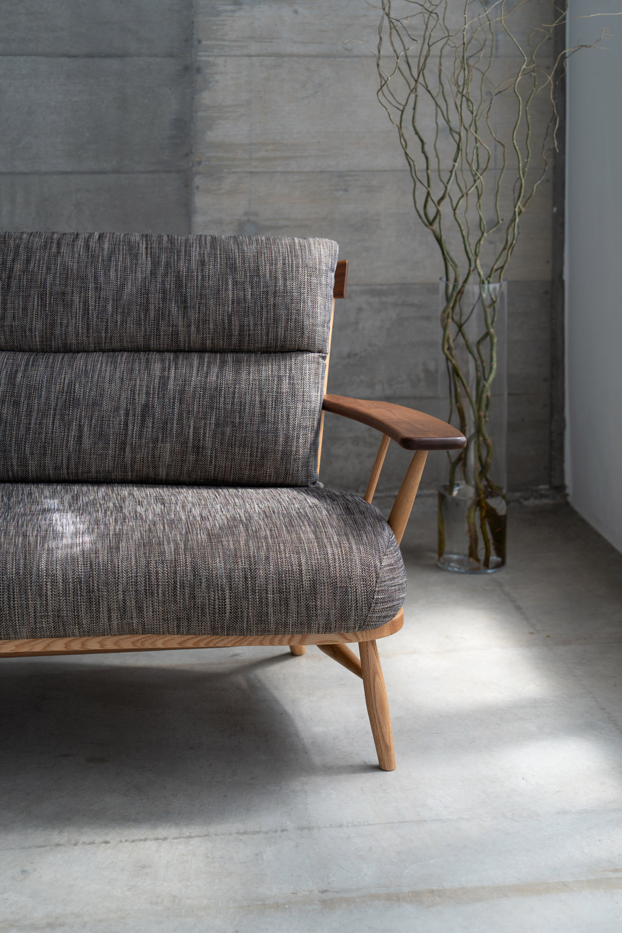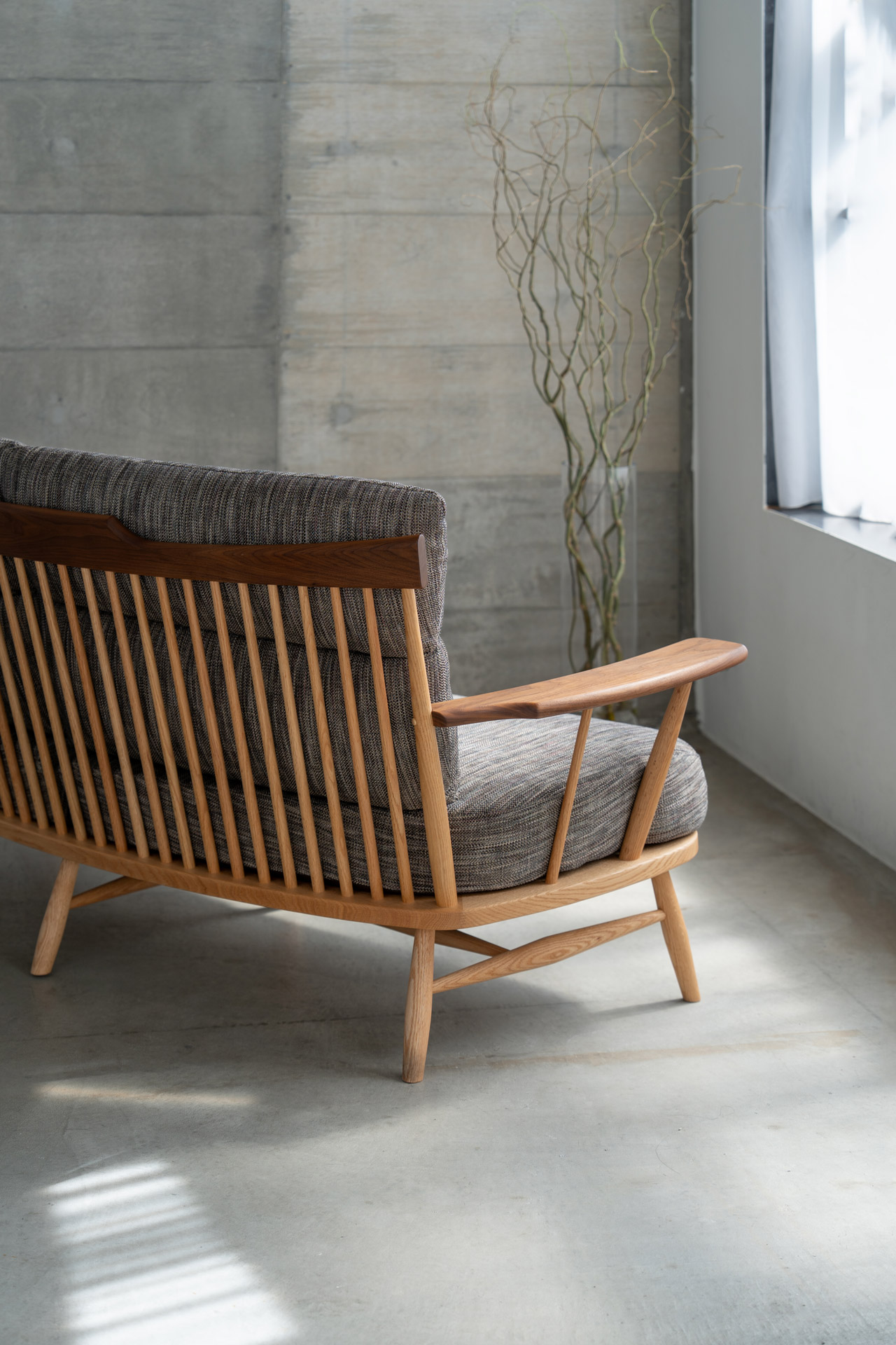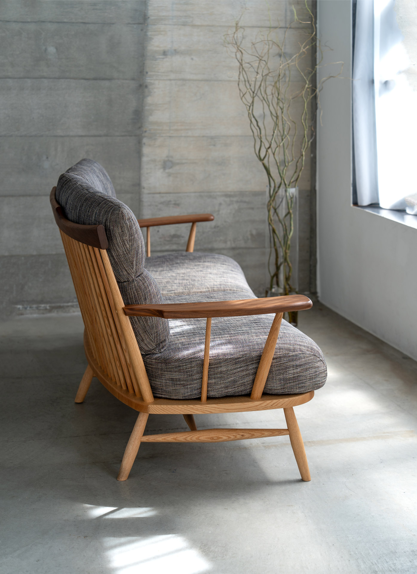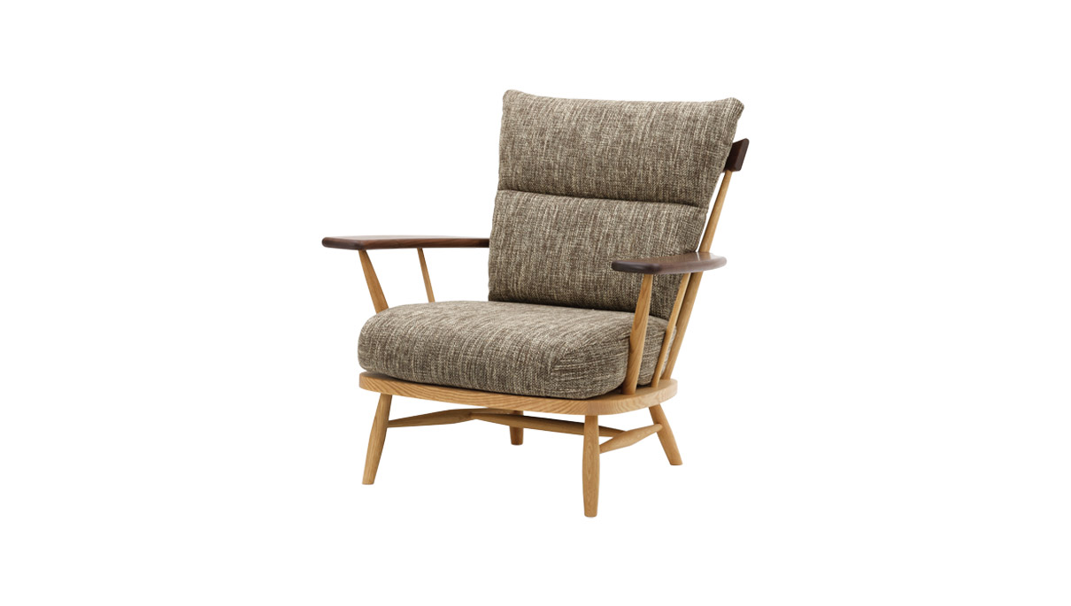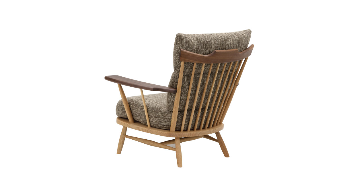 KURA WINDSOR(クラ・ウィンザー)のチェア・シリーズは、デザイナー岩倉榮利と高山の家具挽物技術との出会いに始まり、現代日本における新しいウィンザー・スタイルを「リ・デザイン」という手法によって作り上げました。笠木と挽物の支柱、H字型の貫をつけた脚を厚い木座板の上面、下面に正確に取り付ける技術を土台に、現代的かつ日本的な(パーツのモデュールやバランス、素材の扱いなどの)編集作業を通して、独自の美しさを獲得しています。そこには、一方に新しい素材とそれを活かす斬新な形を創造するものづくりの方法があり、一方で昔から引き継がれてきた様式や技術を時代、地域性や使う人々の特性に従って変化させていくことも、ひとつのデザイン手法であるという提言が見てとれます。